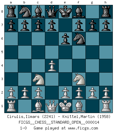 Last move : 1-0 2022 October 14 8:52:58 [Event "FICGS__CHESS__STANDARD_OPEN__000014"] [Site "FICGS"] [Date "2022.09.03"] [Round "1"] [White "Cirulis,Ilmars"] [Black "Knittel,Martin"] [Result "1-0"] [WhiteElo "2241"] [BlackElo "1958"] 1.d4 Nf6 2.Nf3 e6 3.Nc3 1-0 This chess game has been lost on time (started : 2022.09.03 6:24:42) Follow this game move after move (download)War is the child of passion, passion is the child of narcissism and narcissism is the child. (...) Another game ? (Thibault de Vassal) Die Elozahlen sind sehr schlecht für das Schach. Jetzt ist Schach eine Sportindustrie, die darauf zielt Elopunkte zu machen. (Miguel Najdorf) Bendita sea la memoria de aquel que dio al mundo este juego inmortal. (A. G. Gardiner) Tous ces prétendus hommes politiques sont les pions, les Cavaliers, les Tours ou les Fous d'une partie d'échecs qui se jouera tant qu'un hasard ne renversera pas l'échiquier. (Honoré de Balzac) Any activity becomes creative when the doer cares about doing it right or doing it better. (John Updike)