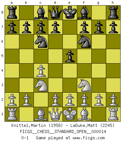 Last move : 0-1 2022 October 14 8:52:58 [Event "FICGS__CHESS__STANDARD_OPEN__000014"] [Site "FICGS"] [Date "2022.09.03"] [Round "1"] [White "Knittel,Martin"] [Black "LaDuke,Matt"] [Result "0-1"] [WhiteElo "1958"] [BlackElo "2245"] 1.c4 e5 2.Nc3 Nf6 3.Nf3 Nc6 0-1 This chess game has been lost on time (started : 2022.09.03 6:24:42) Follow this game move after move (download)The beauty of a move lies not in its' appearance but in the thought behind it. (Siegbert Tarrasch) Um dein Spiel zu verbessern musst du zuallererst das Endspiel studieren, denn diese kann unabhängig studiert werden. Die Eröffnung und das Mittelspiel müssen immer in Bezug gesetzt werden zum Endspiel. (José Raúl Capablanca) Ciertamente el estado mental actual de Bobby Fischer es una tragedia. Uno de los mas grandes jugadores de Ajedrez del mundo -el orgullo y pena del Ajedrez Americano. (Frank Brady) Tout change constamment, y compris dans le monde des Echecs. (Botvinnik) You have to believe in yourself. (Sun Tzu)