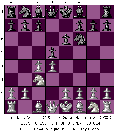 Last move : 0-1 2022 October 14 21:26:20 [Event "FICGS__CHESS__STANDARD_OPEN__000014"] [Site "FICGS"] [Date "2022.09.03"] [Round "2"] [White "Knittel,Martin"] [Black "Swiatek,Janusz"] [Result "0-1"] [WhiteElo "1958"] [BlackElo "2205"] 1.d4 d5 2.c4 e6 3.Nc3 Nf6 0-1 This chess game has been lost on time (started : 2022.09.03 6:24:42) Follow this game move after move (download)In a gambit you give up a Pawn for the sake of getting a lost game. (Samuel Standige Boden) Sehr viele beherrschen heutzutage das große Einmalseins des Schachspiels und kennen sogar dessen Logarithmentafeln auswendig - deshalb sollte man hin und wieder zu beweisen trachten, dass zwei mal zwei auch fünf sein kann. (Mikhail Nekhemyevich Tal) Ser exitoso en el Ajedrez te permite descubrir tu propia personalidad. Eso es lo que deseo para los niños de mi clase. (Saudin Robovic) D'abord les bases : Jouez et étudiez, puis étudiez et jouez, ensuite jouez et étudiez, puis étudiez et jouez. Deuxièmement : Donnez toujours le meilleur de vous-même ! (Ken Smith) Computer Science is no more about computers than astronomy is about telescopes. (Edsger W. Dijkstra)