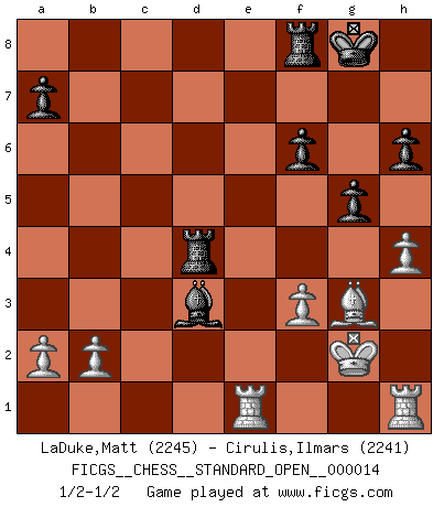 Last move : 1/2-1/2 2022 November 28 4:19:0 [Event "FICGS__CHESS__STANDARD_OPEN__000014"] [Site "FICGS"] [Date "2022.09.03"] [Round "2"] [White "LaDuke,Matt"] [Black "Cirulis,Ilmars"] [Result "1/2-1/2"] [WhiteElo "2245"] [BlackElo "2241"] 1.e4 e6 2.d4 d5 3.Nc3 Nf6 4.exd5 exd5 5.Bd3 Nc6 6.Nf3 Bg4 7.Bb5 Bb4 8.Bxc6+ bxc6 9.O-O O-O 10.h3 Bh5 11.Qd3 c5 12.dxc5 Bxc5 13.Bg5 c6 14.Rae1 Bg6 15.Qd1 h6 16.Bh4 Bh5 17.Qd3 g5 18.Bg3 Bg6 19.Qd2 Ne4 20.Nxe4 dxe4 21.Qc3 exf3 22.Qxc5 fxg2 23.Kxg2 Qd5+ 24.Qxd5 cxd5 25.c3 d4 26.cxd4 Bd3 27.Rh1 Rad8 28.f3 Rxd4 29.h4 f6 1/2-1/2 Follow this game move after move (download)When in doubt... play Chess ! (Tevis) Fallen sollten polizeilich verboten werden. (Savielly Grigorievitsch Tartakower) Si pudieramos observar el interior de la cabeza de un jugador de Ajedrez, encontraríamos ahí un mundo lleno de sentimientos, imágenes, ideas, emoción y pasión. (Alfred Binet) La vérité est comme le meilleur coup aux échecs : elle existe, mais il faut la chercher. (Arturo Perez-Reverte) When you stop learning you start dying. (Scott Adams)