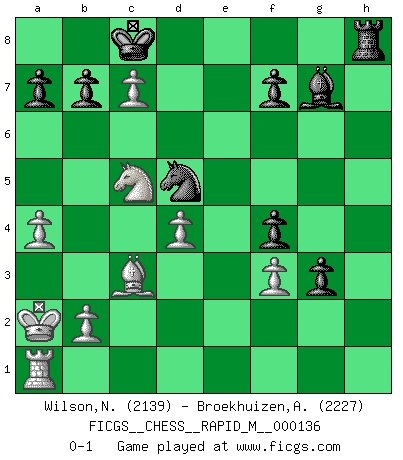 Last move : 0-1 2022 September 28 7:16:46 [Event "FICGS__CHESS__RAPID_M__000136"] [Site "FICGS"] [Date "2022.09.03"] [Round "1"] [White "Wilson,Norman"] [Black "Broekhuizen,A. T. S."] [Result "0-1"] [WhiteElo "2139"] [BlackElo "2227"] 1.e4 e5 2.f4 exf4 3.d4 Qh4+ 4.Ke2 Qe7 5.Kf2 d5 6.exd5 Qh4+ 7.Ke2 Bg4+ 8.Nf3 Bxf3+ 9.gxf3 Nd7 10.Qe1 Qf6 11.Kd1 Ne7 12.Qe4 g5 13.h4 h6 14.c3 O-O-O 15.Kc2 Kb8 16.Bd2 Ng6 17.Be1 Nb6 18.c4 Bg7 19.hxg5 hxg5 20.Rxh8 Rxh8 21.Bc3 Nh4 22.c5 Nf5 23.cxb6 Ne3+ 24.Kc1 Nxf1 25.bxc7+ Kc8 26.a4 g4 27.Kc2 g3 28.Nd2 Ne3+ 29.Kb3 Qb6+ 30.Ka2 Qd6 31.Nb3 Qd7 32.Nc5 Qxd5+ 33.Qxd5 Nxd5 0-1 Follow this game move after move (download)The enormous mental resilience, without which no Chess player can exist, was so much taken up by Chess that he could never free his mind of this game. (Albert Einstein) Nie in meinem Leben habe ich die französische Verteidigung gespielt, welche die Stumpfsinnigste von allen ist. (Wilhelm Steinitz) Observen a Garry Kasparov. Después de una derrota, invariablemente el gana la próxima partida. Prácticamente hace pedazos a su siguiente oponente. Eso es algo que tenemos que aprender a lograr. (Maurice Ashley) Le thème de l'attaque double intervient d'une manière ou d'une autre dans l'immense majorité des combinaisons. (Youri Averbakh) A proverb is a short sentence based on long experience. (Miguel de Cervantes)