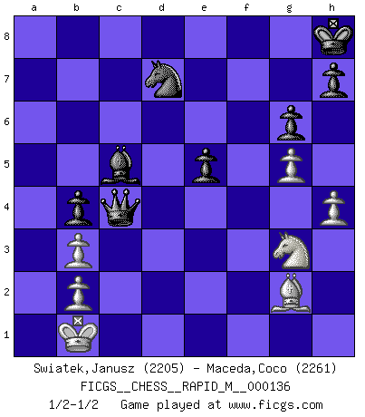 Last move : 1/2-1/2 2022 November 27 6:17:11 [Event "FICGS__CHESS__RAPID_M__000136"] [Site "FICGS"] [Date "2022.09.03"] [Round "1"] [White "Swiatek,Janusz"] [Black "Maceda,Coco"] [Result "1/2-1/2"] [WhiteElo "2205"] [BlackElo "2261"] 1.e4 c5 2.Nf3 d6 3.d4 cxd4 4.Nxd4 Nf6 5.Nc3 a6 6.f3 e5 7.Nb3 Be7 8.Be3 Be6 9.Qd2 O-O 10.O-O-O Nbd7 11.g4 b5 12.g5 b4 13.Ne2 Ne8 14.f4 a5 15.f5 a4 16.fxe6 axb3 17.cxb3 fxe6 18.Bh3 Rxa2 19.Bxe6+ Kh8 20.Ng3 Nc7 21.Bc4 Qa8 22.Rhf1 Rxf1 23.Rxf1 Ra1+ 24.Kc2 Rxf1 25.Bxf1 d5 26.exd5 Nxd5 27.h4 Nxe3+ 28.Qxe3 Bc5 29.Qe2 Qc6 30.Kb1 g6 31.Bg2 Qe6 32.Qc4 Qxc4 1/2-1/2 Follow this game move after move (download)Pawn endings are to Chess what putting is to golf. (Cecil Purdy) Wenn es im Universum noch irgendwo intelligente Lebewesen gibt, dann kennen sie Go. (Emanuel Lasker) El muchacho (en ese entonces un niño de 12 años llamado Anatoly Karpov) no tiene ni idea de lo que es el Ajedrez y no hay futuro en absoluto para el en esta profesión. (Mikhail Botvinnik) Je ne crois pas en la psychologie, je crois aux bons coups. (Robert Fischer) Never risk one's whole fortune unless supported by one's entire army. (Niccolo Machiavelli)
