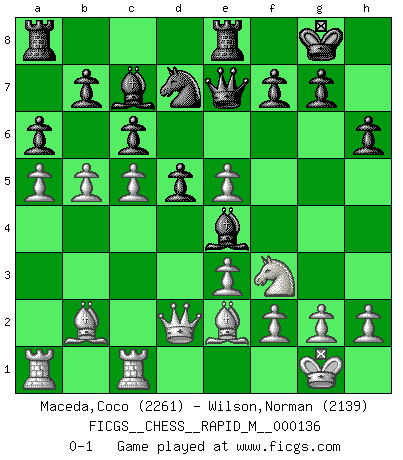 Last move : 0-1 2022 October 27 20:59:33 [Event "FICGS__CHESS__RAPID_M__000136"] [Site "FICGS"] [Date "2022.09.03"] [Round "1"] [White "Maceda,Coco"] [Black "Wilson,Norman"] [Result "0-1"] [WhiteElo "2261"] [BlackElo "2139"] 1.c4 Nf6 2.b3 c6 3.Nf3 d5 4.Bb2 Bg4 5.e3 e6 6.Be2 Nbd7 7.a3 h6 8.d4 Bf5 9.Nbd2 Bd6 10.O-O O-O 11.b4 Qe7 12.c5 Bc7 13.a4 Ne4 14.b5 Nxd2 15.Qxd2 e5 16.dxe5 Rfe8 17.Rfc1 Be4 18.a5 a6 0-1 This chess game has been lost on time (started : 2022.09.03 8:32:36) Follow this game move after move (download)For me, Chess is life and every game is like a new life. Every Chess player gets to live many lives in one lifetime. (Eduard Gufeld) Du kannst im Schach nur gut werden, wenn du das Spiel liebst. (Robert James Fischer) No hay otro maestro que tenga una voluntad terrífica de ganar. Al tablero, el irradía peligro y aún los oponentes mas fuertes tienden a congelarse como liebres cuando olfatean a una pantera. Aún sus debilidades son peligrosas. Con las blancas, su juego de apertura es predecible - te es posible hacer planes en su contra - pero es tan fuerte que tus planes casi nunca funcionan. En el juego medio, su precisión e invención son fabulosas y en finales, tú simplemente no le puedes vencer. (Experto Alemán anónimo) Le plus grand jeu de l'esprit jamais inventé, plus vous l'apprenez, plus vous y prenez du plaisir. (Garry Kasparov) If you are good, you will be assigned all the work. If you are really good, you will get out of it. (Dan Rotaru)