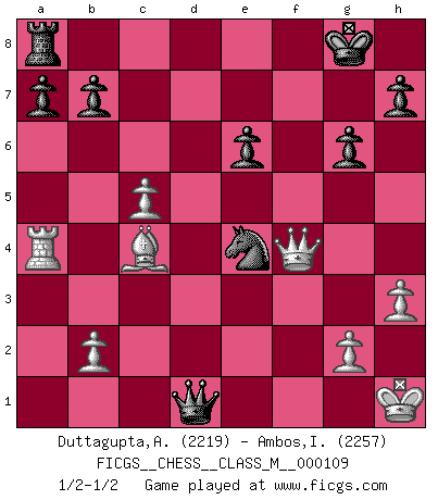 Last move : 1/2-1/2 2023 January 9 15:54:43 [Event "FICGS__CHESS__CLASS_M__000109"] [Site "FICGS"] [Date "2022.09.07"] [Round "1"] [White "Duttagupta,Aniruddha"] [Black "Ambos,Ilmar"] [Result "1/2-1/2"] [WhiteElo "2219"] [BlackElo "2257"] 1.d4 Nf6 2.c4 g6 3.Nc3 Bg7 4.e4 d6 5.f4 O-O 6.Nf3 c5 7.d5 e6 8.Be2 exd5 9.cxd5 Re8 10.e5 dxe5 11.fxe5 Ng4 12.e6 fxe6 13.d6 Bd7 14.O-O Nc6 15.Kh1 Rf8 16.Bg5 Qb6 17.Na4 Qa5 18.Bd2 Nb4 19.a3 Bxa4 20.Qc1 Qb6 21.axb4 Qxd6 22.bxc5 Qd7 23.h3 Nf6 24.Ne5 Qd5 25.Rxa4 Ne4 26.Bf4 Bxe5 27.Bc4 Rxf4 28.Rxf4 Bxf4 29.Qxf4 Qd1+ 1/2-1/2 Follow this game move after move (download)The tactician must know what to do whenever something needs doing; the strategist must know what to do when nothing needs doing. (Savielly Tartakover) Strategie ist, wie man ein Mädchen auf den Rücksitz bekommt. Taktik ist, was man tut, wenn man dann dort ist. (Anonymous) La señal de un Gran Maestro es su habilidad de ganar una partida rápidamente y sin dolor. (Irving Chernev) Les Echecs, c'est l'art de la guerre sans les charniers, c'est la résurrection des morts tombés au champ d'honneur, l'espoir perpétuel, la suprématie de l'intelligence sur la force, la culture de l'esprit. (F. Szpiner) War is the child of passion, passion is the child of narcissism and narcissism is the child. (...) Another game ? (Thibault de Vassal)