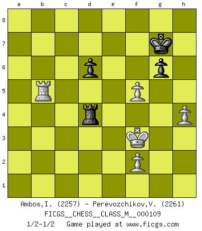 Last move : 1/2-1/2 2022 October 18 11:26:26 [Event "FICGS__CHESS__CLASS_M__000109"] [Site "FICGS"] [Date "2022.09.07"] [Round "1"] [White "Ambos,Ilmar"] [Black "Perevozchikov,Vjacheslav"] [Result "1/2-1/2"] [WhiteElo "2257"] [BlackElo "2261"] 1.d4 Nf6 2.c4 g6 3.Nc3 d5 4.Nf3 Bg7 5.cxd5 Nxd5 6.e4 Nxc3 7.bxc3 c5 8.Rb1 O-O 9.Be2 cxd4 10.cxd4 Qa5+ 11.Bd2 Qxa2 12.O-O Bg4 13.Be3 Nc6 14.d5 Ne5 15.Rxb7 a5 16.Re1 Nxf3+ 17.Bxf3 Bxf3 18.gxf3 Qc4 19.Qb1 Qc3 20.Kg2 a4 21.Re2 Rfe8 22.Ra2 Be5 23.Rc2 Qa5 24.f4 Bg7 25.d6 exd6 26.R2c7 Rf8 27.h3 Rac8 28.Rxc8 Rxc8 29.Qa2 Rf8 30.Ra7 Qb5 31.Rxa4 Qc6 32.Rc4 Qd7 33.Qa5 Rc8 34.Rb4 Bc3 35.Qb5 Qxb5 36.Rxb5 Rc4 37.Kf3 Bd4 38.Bxd4 Rxd4 39.f5 Kg7 40.fxg6 hxg6 41.h4 f5 42.exf5 1/2-1/2 Follow this game move after move (download)As one by one I mowed them down, my superiority soon became apparent. (Jose Capablanca) Wenn ein Kopf und ein Buch zusammenstoßen und es klingt hohl, ist es denn allemal im Buche? (Georg Christoph Lichtenberg) Tu eres para mi la Reina en d8 y yo soy el Peón en d7!!. (GM Eduard Gufeld) Votre prénom est 'Tactique', votre deuxième prénom est 'Tactique' et votre nom est 'Tactique'. (Ken Smith) Men should grow up. - Yeah. And dogs should stop licking themselves. It's not gonna happen. (Gregory House to Dr. Cameron, House M.D.)