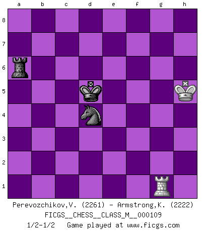 Last move : 1/2-1/2 2022 November 26 9:18:56 [Event "FICGS__CHESS__CLASS_M__000109"] [Site "FICGS"] [Date "2022.09.07"] [Round "1"] [White "Perevozchikov,Vjacheslav"] [Black "Armstrong,Keith"] [Result "1/2-1/2"] [WhiteElo "2261"] [BlackElo "2222"] 1.d4 Nf6 2.Nf3 e6 3.g3 c5 4.Bg2 cxd4 5.Nxd4 d5 6.O-O e5 7.Nb3 Be6 8.e4 Nc6 9.exd5 Bxd5 10.Bh3 Bb4 11.c3 Be7 12.Qe2 O-O 13.Be3 h6 14.c4 Be6 15.Bxe6 fxe6 16.Nc3 Rc8 17.Nb5 b6 18.Rac1 Qe8 19.c5 Nd5 20.cxb6 axb6 21.Bd2 Rf5 22.Nc3 Rd8 23.Nxd5 Rxd5 24.Be3 Bg5 25.Bxg5 Rxg5 26.Rfe1 Nb4 27.Rcd1 Qd7 28.Rxd5 exd5 29.a3 Nc6 30.Qb5 Kh7 31.Rd1 e4 32.Rc1 Rg6 33.Nd4 Ne5 34.Qxd7 Nxd7 35.b4 Ne5 36.a4 Nc4 37.Ra1 Rf6 38.Kf1 g5 39.Ke2 Kg6 40.g4 Ne5 41.a5 bxa5 42.bxa5 Ra6 43.Nb3 Nxg4 44.Nc5 Ra7 45.a6 Kf5 46.f3 exf3+ 47.Kxf3 h5 48.h3 Ne5+ 49.Kg3 Nc6 50.h4 gxh4+ 51.Kxh4 d4 52.Rg1 Ke5 53.Kxh5 Kd5 54.Nb3 Rxa6 55.Nxd4 Nxd4 1/2-1/2 Follow this game move after move (download)By playing at Chess then, we may learn: First: Foresight... Second: Circumspection... Third: Caution... And lastly, we learn by Chess the habit of not being discouraged by present bad appearances in the state of our affairs, the habit of hoping for a favorable chance, and that of persevering in the secrets of resources. (Benjamin Franklin) Schach ist ein schwarz-weisser Dschungel. (Garry Kasparov) ¿Cual es el objetivo de jugar una apertura de gambito?... Para adquirir una reputación de ser un jugador apuesto a costo de perder el juego. (Siegbert Tarrasch) Nous vivons dans un monde échiquéen : chaque jour qui passe est un défi à relever. (Philosophe Sasha) He is a liar. I just don't know what the lie is yet. (Horatio Caine, C.S.I. Miami)