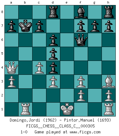 Last move : 1-0 2022 September 15 19:39:14 [Event "FICGS__CHESS__CLASS_C__000305"] [Site "FICGS"] [Date "2022.09.08"] [Round "1"] [White "Domingo,Jordi"] [Black "Pintor,Manuel"] [Result "1-0"] [WhiteElo "1962"] [BlackElo "1693"] 1.b4 e5 2.Bb2 Qf6 3.Nf3 d6 4.c4 Bg4 5.Nc3 Ne7 6.d4 Bxf3 7.gxf3 Nbc6 8.d5 Nxb4 9.Qa4+ Nec6 10.a3 Nd3+ 11.exd3 O-O-O 12.dxc6 bxc6 13.Bh3+ Kb7 14.Nd5 cxd5 15.Bd4 exd4 16.Rb1+ 1-0 Follow this game move after move (download)When you don't know what to play, wait for an idea to come into your opponent's mind. You may be sure that idea will be wrong. (Siegbert Tarrasch) Ohne Fehler kann es keine Brillanz geben. (Emanuel Lasker) Aunque la mayoría de la gente disfruta observar las partidas de los grandes Maestros de ataque, algunos de los jugadores mas notables en la historia han sido los jugadores silenciosos posicionales. Lentamente ellos te aplastan despojandote de tu espacio, congestionando tus piezas y dejandote virtualmente sin nada que hacer. (Yasser Seirawan) Les réformistes prétendent que les progrès de la théorie conduiront à la disparition des échecs, et qu'il faut, pour leur rendre vie, en remanier les règles. En réalité, qu'exprime cette affirmation? Le mépris de l'intuition, de l'imagination et de tous les autres éléments qui font des échecs un art. (Alexander Alekhine) There is a great deal of difference between an eager man who wants to read a book and a tired man who wants a book to read. (G.K. Chesterton)