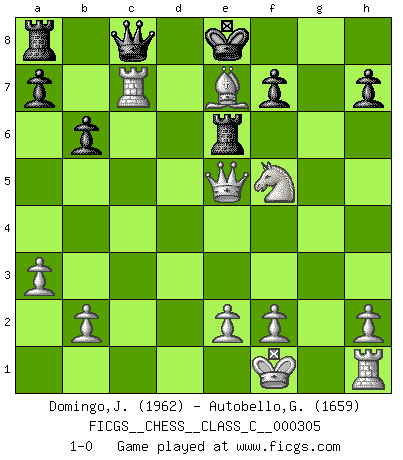 Last move : 1-0 2023 February 6 23:8:38 [Event "FICGS__CHESS__CLASS_C__000305"] [Site "FICGS"] [Date "2022.09.08"] [Round "1"] [White "Domingo,Jordi"] [Black "Autobello,Giovanni"] [Result "1-0"] [WhiteElo "1962"] [BlackElo "1659"] 1.g4 d5 2.Bg2 Bxg4 3.c4 e6 4.cxd5 exd5 5.Qb3 Be6 6.Nc3 b6 7.Bxd5 Bxd5 8.Nxd5 Nf6 9.Qe3+ Be7 10.Nxf6+ gxf6 11.Qe4 Nd7 12.Nf3 Nc5 13.Qc6+ Kf8 14.d4 Nd7 15.Bh6+ Ke8 16.Nh4 Rg8 17.Nf5 Bb4+ 18.Kf1 Qc8 19.Rc1 Rg6 20.Qe4+ Kd8 21.a3 Bf8 22.Bxf8 Ne5 23.Be7+ Ke8 24.dxe5 fxe5 25.Qxe5 Re6 26.Rxc7 1-0 Follow this game move after move (download)I give 98 percent of my mental energy to Chess. Others give only 2 percent. (Bobby Fischer) Wenn ich gewinne bin ich ein Genie. Wenn nicht, dann bin ich keines. (Robert James Fischer) En un gambito tu regalas un Peón por el bién de tomar un juego perdido. (Samuel Standige Boden) Celui qui prend des risques peut perdre, celui qui n'en prend pas perd toujours. (Xavier Tartacover) A good programmer is someone who always looks both ways before crossing a one-way street. (Doug Linder)