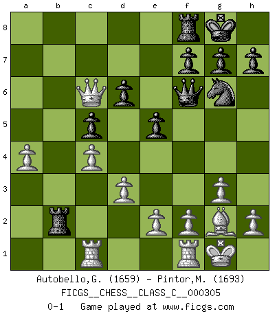 Last move : 0-1 2022 December 3 10:9:36 [Event "FICGS__CHESS__CLASS_C__000305"] [Site "FICGS"] [Date "2022.09.08"] [Round "1"] [White "Autobello,Giovanni"] [Black "Pintor,Manuel"] [Result "0-1"] [WhiteElo "1659"] [BlackElo "1693"] 1.c4 e5 2.Nc3 Bc5 3.g3 d6 4.Bg2 Qf6 5.Nf3 Bf5 6.O-O Ne7 7.d3 O-O 8.Bg5 Qe6 9.Rc1 c6 10.Qb3 Bb6 11.Na4 Nd7 12.Nxb6 axb6 13.Nh4 Ng6 14.Nxf5 Qxf5 15.Be3 Nc5 16.Bxc5 bxc5 17.Qxb7 Rab8 18.Qxc6 Rxb2 19.a4 Qf6 0-1 Follow this game move after move (download)By the beauty of his games, the clarity of his play, and the brilliance of his ideas, Fischer made himself an artist of the same stature as Brahms, Rembrandt, and Shakespeare. (David Levy) Mein Name ist Rustam Kamsky. Sie haben meinen Sohn belästigt. Bereiten Sie sich aufs Sterben vor. (Rustam Kamsky) Yo considero que Fischer es uno de los expertos mas grandes de aperturas de siempre. (Keith Hayward) À la honte des hommes, on sait que les lois du jeu sont les seules qui soient partout justes, claires, inviolables et exécutées. Pourquoi l'Indien qui a donné les règles du jeu d'échecs est-il obéi de bon gré dans toute la terre, et que les décrétales des papes, par exemple, sont aujourd'hui un objet d'horreur et de mépris ? C'est que l'inventeur des échecs combina tout avec justesse pour la satisfaction des joueurs, et que les papes, dans leurs décrétales, n'eurent en vue que leur seul avantage. L'Indien voulut exercer également l'esprit des hommes et leur donner du plaisir; les papes ont voulu abrutir l'esprit des hommes. Voltaire (Dictionnaire philosophique / Garnier 1967) The age of a woman doesn't mean a thing. The best tunes are played on the oldest fiddles. (Ralph Waldo Emerson)
