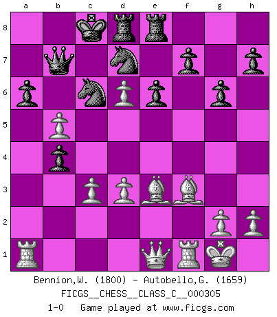 Last move : 1-0 2023 February 4 21:35:38 [Event "FICGS__CHESS__CLASS_C__000305"] [Site "FICGS"] [Date "2022.09.08"] [Round "1"] [White "Bennion,William"] [Black "Autobello,Giovanni"] [Result "1-0"] [WhiteElo "1800"] [BlackElo "1659"] 1.e4 c5 2.Na3 a6 3.c3 Nc6 4.f4 d6 5.d3 Nf6 6.Nf3 Bg4 7.Be2 Qc7 8.O-O g6 9.e5 dxe5 10.fxe5 Nd7 11.Bf4 e6 12.Nc4 Bxf3 13.Bxf3 b5 14.Nd6+ Bxd6 15.exd6 Qb6 16.Qe1 O-O-O 17.a4 Rhe8 18.b4 cxb4 19.Be3 Qb7 20.axb5 1-0 Follow this game move after move (download)A man that will take back a move at Chess will pick a pocket. (Richard Fenton) Heutzutage gewinnt im Turnier nicht derjenige Spieler, der weitreichende Pläne entwirft, sondern einfach jener, der Zug um Zug kämpft. (David Bronstein) Fischer es el jugador mas fuerte del mundo. De hecho, el jugador mas fuerte que jamas haya existido. (Larry Evans) Que feriez-vous si vous étiez en train de jouer aux échecs et que la fin du monde arrive ? Je continuerais à jouer. (Saint Borromée) Pushing plastic is for the many, pushing virtual pieces is for the fewer, pushing wood is for the very few. (Normajean Yates)