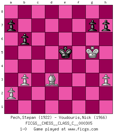 Last move : 1-0 2023 October 2 19:48:23 [Event "FICGS__CHESS__CLASS_C__000305"] [Site "FICGS"] [Date "2022.09.08"] [Round "1"] [White "Pech,Stepan"] [Black "Voudouris,Nick"] [Result "1-0"] [WhiteElo "1922"] [BlackElo "1966"] 1.c4 f5 2.d4 d5 3.cxd5 Qxd5 4.Nc3 Qd8 5.e3 Nf6 6.Nf3 e6 7.Bc4 Bd6 8.O-O O-O 9.Re1 c5 10.Qd3 Qe7 11.dxc5 Bxc5 12.e4 Ng4 13.Re2 f4 14.h3 Nxf2 15.Rxf2 Nc6 16.Qf1 b6 17.Kh1 Bxf2 18.Qxf2 Na5 19.Be2 Bb7 20.b3 Rab8 21.Nb5 Bxe4 22.Ba3 Qf6 23.Re1 Rfd8 24.Bd6 Rbc8 25.Be5 Qf5 26.Nd6 Rxd6 27.Bxd6 Rd8 28.Bc7 Rd7 29.Qh4 Nc6 30.Bxf4 Nd4 31.Nxd4 Rxd4 32.Bg4 Bxg2+ 33.Kxg2 Qxf4 34.Bxe6+ Kf8 35.Qxf4+ Rxf4 36.Bc4 Rf6 37.Rf1 Ke7 38.Rxf6 Kxf6 39.Kf3 Kg5 40.Ba6 Kf6 41.Kf4 Ke6 42.Kg5 Ke5 43.Bd3 1-0 Follow this game move after move (download)Chess, like any creative activity, can exist only through the combined efforts of those who have creative talent, and those who have the ability to organize their creative work. (Mikhail Botvinnik) Wir irren allesamt, nur jeder irrt anders. (Georg Christoph Lichtenberg) Hay jugadores fuertes y personas amables y yo soy un jugador fuerte. (Bobby Fischer) Karpov est une pièce de musée. (Garry Kasparov) Once you start thinking you have nothing left to learn, you have everything to learn. (Steve Badget)