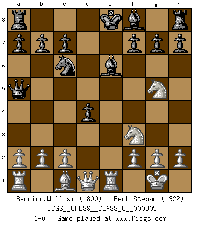 Last move : 1-0 2022 November 2 16:34:31 [Event "FICGS__CHESS__CLASS_C__000305"] [Site "FICGS"] [Date "2022.09.08"] [Round "1"] [White "Bennion,William"] [Black "Pech,Stepan"] [Result "1-0"] [WhiteElo "1800"] [BlackElo "1922"] 1.e4 e5 2.Nf3 Nc6 3.d4 exd4 4.Bc4 Nf6 5.O-O Nxe4 6.Re1 d5 7.Bxd5 Qxd5 8.Nc3 Qa5 9.Nxe4 Be6 10.Neg5 1-0 This chess game has been lost on time (started : 2022.09.08 17:9:17) Follow this game move after move (download)Chess is a foolish expedient for making idle people believe they are doing something very clever when they are only wasting their time. (George Bernard Shaw) Du musst Deinen Gegner in einen tiefen dunklen Wald führen wo 2+2=5 ist und wo der Weg, der wieder hinausführt, nur breit genug für einen ist. (Mikhail Nekhemyevich Tal) El jugador táctico sabe que hacer cuando hay algo que hacer; mientras que el estratega sabe que hacer cuando no hay nada que hacer. (Gerald Abrahams) Les réformistes prétendent que les progrès de la théorie conduiront à la disparition des échecs, et qu'il faut, pour leur rendre vie, en remanier les règles. En réalité, qu'exprime cette affirmation? Le mépris de l'intuition, de l'imagination et de tous les autres éléments qui font des échecs un art. (Alexander Alekhine) There will be no order, only chaos. (Sol Robeson in Pi by Darren Aronofsky)
