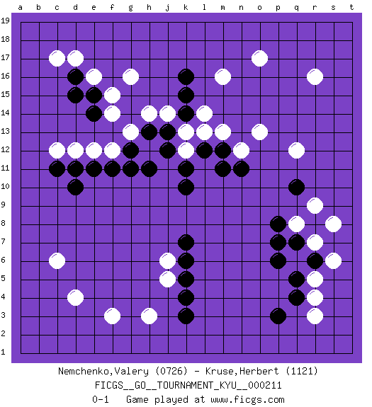 Last move : 0-1 2022 November 26 6:41:43 [Event "FICGS__GO__TOURNAMENT_KYU__000211"] [Site "FICGS"] [Date "2022.09.14"] [Round "1"] [Black "Nemchenko,Valery"] [White "Kruse,Herbert"] [Result "0-1"] [Rating 1 "0726"] [Rating 2 "1121"] 1.k10 r16 2.d16 d4 3.q4 o17 4.k16 r3 5.p3 r4 6.q5 s6 7.r6 r7 8.q7 r5 9.p6 q8 10.r8 q6 11.p7 r9 12.r6 s8 13.p8 h3 14.q10 c17 15.d10 d17 16.k4 j5 17.k5 j6 18.k6 c6 19.k3 e16 20.d15 d12 21.d11 e12 22.e11 f12 23.f11 c12 24.c11 g16 25.e15 f15 26.e14 f14 27.g12 g13 28.h13 h14 29.k7 m16 30.j13 j14 31.k14 h12 32.g11 k13 33.j12 k12 34.h11 l14 35.k15 m13 36.k11 o13 37.l12 l13 38.m12 n12 39.m11 q12 40.n11 f3 0-1 This go game has been lost on time (started : 2022.09.14 15:37:10) Follow this game move after move (download)Josekis are not fixed, definitive things. They indicate the moments when everything can change. (Pierre Audouard) The beginning is the most important part of the work. (Plato)
