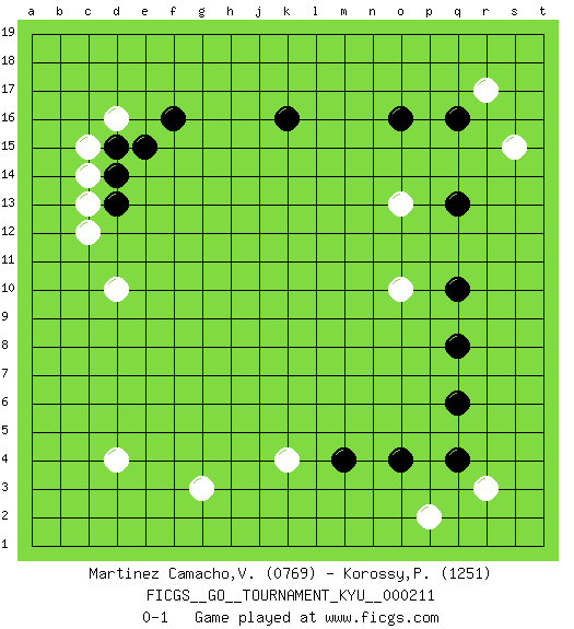 Last move : 0-1 2022 November 4 8:19:28 [Event "FICGS__GO__TOURNAMENT_KYU__000211"] [Site "FICGS"] [Date "2022.09.14"] [Round "1"] [Black "Martinez Camacho,Victor Hugo"] [White "Korossy,Peter"] [Result "0-1"] [Rating 1 "0769"] [Rating 2 "1251"] 1.q4 d4 2.q16 d16 3.k16 k4 4.q10 d10 5.f16 c14 6.m4 r3 7.q6 p2 8.o4 g3 9.e15 o10 10.q8 o13 11.q13 r17 12.o16 s15 13.d14 c13 14.d13 c12 15.d15 c15 0-1 This go game has been lost on time (started : 2022.09.14 15:37:10) Follow this game move after move (download)While the Baroque rules of chess could only have been created by humans, the rules of go are so elegant, organic, and rigorously logical that if intelligent life forms exist elsewhere in the universe, they almost certainly play go. (Edward Lasker, international chess master) Wisdom begins at the end. (Daniel Webster)