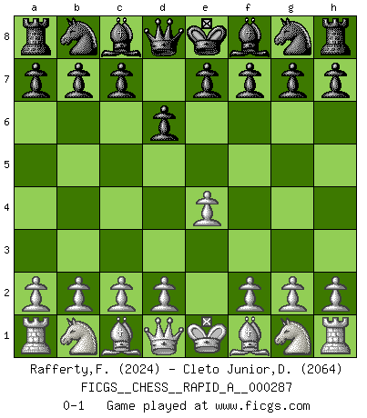 Last move : 0-1 2022 November 16 11:52:47 [Event "FICGS__CHESS__RAPID_A__000287"] [Site "FICGS"] [Date "2022.09.17"] [Round "1"] [White "Rafferty,Frey"] [Black "Cleto Junior,Dirceu"] [Result "0-1"] [WhiteElo "2024"] [BlackElo "2064"] 1.e4 d6 0-1 Follow this game move after move (download)Chess is everything: art, science and sport. (Anatoly Karpov) Ein Springer auf f6 gegen die eigene Rochadestellung ist schlimmer als ein rostiger Nagel im Knie. (Efim Bogoljubov) En el tablero, la mentira e hipocresía no sobreviven mucho. (Emanuel Lasker) On entre au jeu d'Echecs comme on entre en Religion. Pour le joueur d'Echecs, la partie d'Echecs c'est l'office, la messe, le défilé du 1er Mai, le dépôt de gerbe au Monument aux Morts. C'est un drame sacré. (Michel Roos) Internal peace cannot coexist with external war. (Don Groves)