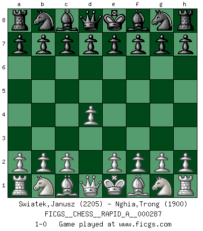 Last move : 1-0 2022 October 18 1:52:39 [Event "FICGS__CHESS__RAPID_A__000287"] [Site "FICGS"] [Date "2022.09.17"] [Round "1"] [White "Swiatek,Janusz"] [Black "Nghia,Trong"] [Result "1-0"] [WhiteElo "2205"] [BlackElo "1900"] 1.d4 1-0 This chess game has been lost on time (started : 2022.09.17 0:22:57) Follow this game move after move (download)Combinations have always been the most intriguing aspect of Chess. The masters look for them, the public applauds them, the critics praise them. It is because combinations are possible that Chess is more than a lifeless mathematical exercise. They are the poetry of the game; they are to Chess what melody is to music. They represent the triumph of mind over matter. (Reuben Fine) Was ist der Unterschied zwischen einem Strassenarbeiter und einem Schachspieler? --Der Schachspieler bewegt sich ab und zu. (Anonymous) Vive, pierde y aprende al observar a tu oponente como gana. (Amber Steenbock) Ce n'est pas pour s'amuser qu'il joue aux échecs : il célèbre un culte. (Vladimir Nabokov) At last I discovered the true beauty of chess. So I proposed to her. (Dinesh De Silva)