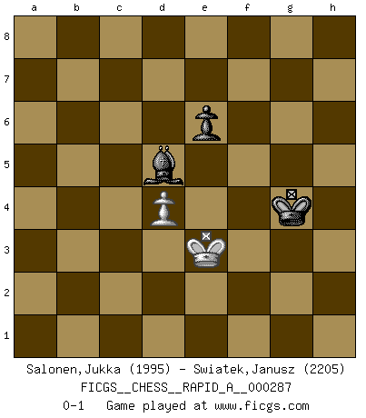 Last move : 0-1 2023 January 23 7:22:15 [Event "FICGS__CHESS__RAPID_A__000287"] [Site "FICGS"] [Date "2022.09.17"] [Round "1"] [White "Salonen,Jukka"] [Black "Swiatek,Janusz"] [Result "0-1"] [WhiteElo "1995"] [BlackElo "2205"] 1.e4 e5 2.Nf3 Nc6 3.Bb5 Nf6 4.O-O Nxe4 5.d4 Nd6 6.Bxc6 dxc6 7.dxe5 Nf5 8.Qxd8+ Kxd8 9.Rd1+ Ke8 10.Nc3 Ne7 11.h3 Ng6 12.Re1 Bb4 13.Bd2 Bxc3 14.Bxc3 c5 15.a3 b6 16.Rad1 Nf8 17.b4 cxb4 18.axb4 Ne6 19.Nd4 Nxd4 20.Rxd4 Be6 21.Bd2 h6 22.Rd3 Ke7 23.f4 Rhd8 24.Kf2 Rxd3 25.cxd3 h5 26.Ra1 g6 27.Ke3 Kd7 28.Ke2 Kc6 29.Rc1+ Kb7 30.Ra1 Rc8 31.Rc1 Bf5 32.Be1 Rd8 33.Rd1 c6 34.Bh4 Rd4 35.Be7 Rd5 36.d4 Be6 37.Ke3 a5 38.Rb1 Rb5 39.Bd6 h4 40.Bf8 Kc8 41.Be7 Kd7 42.Bxh4 axb4 43.g4 c5 44.Be1 Kc6 45.Rc1 b3 46.Rb1 c4 47.Ke4 Ra5 48.Bxa5 bxa5 49.f5 gxf5+ 50.gxf5 Bd5+ 51.Ke3 a4 52.Kd2 Be4 53.e6 fxe6 54.f6 Kd7 55.f7 Ke7 56.Rf1 Kf8 57.Kc3 a3 58.Kxc4 b2 59.Kb3 b1Q+ 60.Rxb1 Bxb1 61.Kxa3 Be4 62.Kb4 Kxf7 63.Kc5 Bd5 64.Kb4 Kg6 65.Kc5 Kg5 66.Kd6 Kh4 67.Ke5 Kxh3 68.Kf4 Kh4 69.Ke3 Kg4 0-1 Follow this game move after move (download)No other master has such a terrific will to win. At the board he radiates danger, and even the strongest opponents tend to freeze, like rabbits when they smell a panther. Even his weaknesses are dangerous. As white, his opening game is predictable - you can make plans against it - but so strong that your plans almost never work. In the middle game his precision and invention are fabulous, and in the end game you simply cannot beat him. (Anonymous German Expert) Bis jetzt ist Weiß einer wohlbekannten Analyse gefolgt. Aber jetzt begeht er einen schrecklichen Fehler: Er beginnt seinen eigenen Kopf zu benutzen. (Siegbert Tarrasch) Hay jugadores fuertes y personas amables y yo soy un jugador fuerte. (Bobby Fischer) Comme les marins qui ont mille raisons différentes d'aller en mer, les joueurs d'échecs en ont tout autant avant de s'installer devant une table et jouer... (Vincent Bertignac, philosophe) Art disturbs, science reassures. (Georges Braque, Le Jour et la Nuit)