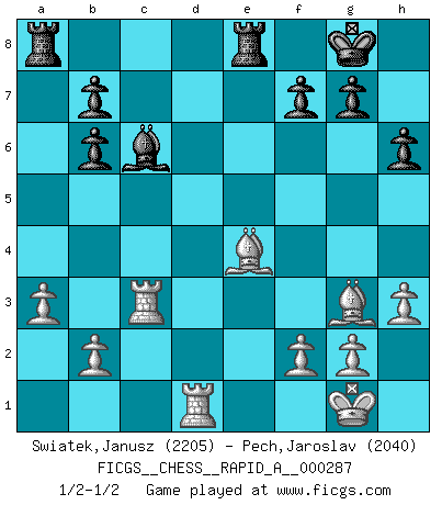 Last move : 1/2-1/2 2022 November 27 15:47:19 [Event "FICGS__CHESS__RAPID_A__000287"] [Site "FICGS"] [Date "2022.09.17"] [Round "1"] [White "Swiatek,Janusz"] [Black "Pech,Jaroslav"] [Result "1/2-1/2"] [WhiteElo "2205"] [BlackElo "2040"] 1.d4 d5 2.c4 e6 3.Nc3 Nf6 4.Bg5 Be7 5.cxd5 exd5 6.e3 O-O 7.Bd3 h6 8.Bh4 c6 9.Bg3 c5 10.Nge2 Nc6 11.O-O Bg4 12.dxc5 Bxc5 13.Qb3 Re8 14.Rac1 Qb6 15.Qxb6 axb6 16.a3 d4 17.Nxd4 Nxd4 18.exd4 Bxd4 19.h3 Bd7 20.Rfd1 Bc6 21.Bf5 Bxc3 22.Rxc3 Ne4 23.Bxe4 1/2-1/2 Follow this game move after move (download)Chess is a matter of delicate judgment, knowing when to punch and how to duck. (Bobby Fischer) Ich erzeugte keinen Neid, da mich die Schachspieler als Musiker und die Musiker als Schachspieler betrachteten. (Mark Taimanov) A la fecha, Fischer esta simplemente un nivel arriba de todos los mejores jugadores de Ajedrez del mundo. (John Jacobs) La vie est comme un jeu d'échecs : nous esquissons un plan, mais celui-ci est tributaire de ce que daignent faire l'adversaire aux échecs et le destin dans la vie. (Arthur Schopenhauer) Locking firmely the window serves nothing, only small thiefs pass through there, the big thiefs enter through the front door. (Luc-Olivier Leclerc)