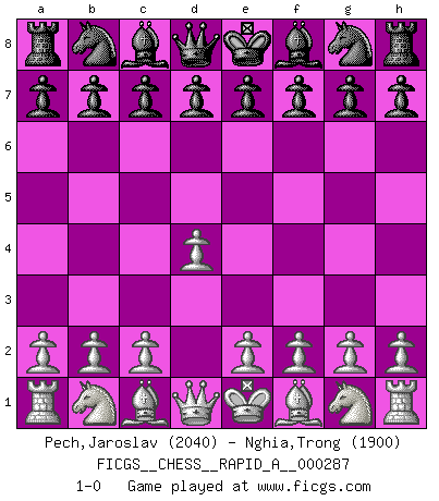 Last move : 1-0 2022 October 19 6:8:13 [Event "FICGS__CHESS__RAPID_A__000287"] [Site "FICGS"] [Date "2022.09.17"] [Round "1"] [White "Pech,Jaroslav"] [Black "Nghia,Trong"] [Result "1-0"] [WhiteElo "2040"] [BlackElo "1900"] 1.d4 1-0 This chess game has been lost on time (started : 2022.09.17 0:22:57) Follow this game move after move (download)Not only will I predict his triumph over Botvinnik, but I'll go further and say that he'll probably be the greatest Chess player that ever lived. (John Collins) Das typische an einem Großmeister ist, daß er eine gewonnene Position schnell und schmerzlos gewinnt. (Irving Chernev) Coloca el contenido de las piezas del Ajedrez en un sombrero, agitalo vigorosamente, arrojalas en un tablero desde una altura de 30 centimetros y así obtendras el estilo de Steinitz. (H. E. Bird) Que feriez-vous si vous étiez en train de jouer aux échecs et que la fin du monde arrive ? Je continuerais à jouer. (Saint Borromée) Think like a man of action, act like a man of thought. (Henri Louis Bergson)