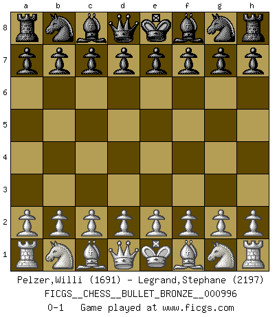 Last move : 0-1 2022 September 22 6:10:47 [Event "FICGS__CHESS__BULLET_BRONZE__000996"] [Site "FICGS"] [Date "2022.09.21"] [Round "1"] [White "Pelzer,Willi"] [Black "Legrand,Stephane"] [Result "0-1"] [WhiteElo "1691"] [BlackElo "2197"] 0-1 This chess game has been lost on time (started : 2022.09.21 14:42:28) Follow this game move after move (download)I have always a slight feeling of pity for the man who has no knowledge of Chess. (Siegbert Tarrasch) Ich bin stolz ein Bulgare zu sein. (Veselin Topalov) Todos los Maestros de Ajedrez fueron un día unos principiantes. (Chernev) Un footballeur joue avec ses pieds, parfois avec sa tête. Un joueur d'échecs ne joue qu'avec sa tête. Et quand il ne joue plus, il meurt. (Jacob Murray) Faith : not wanting to know what is true. (Friedrich Nietzsche)