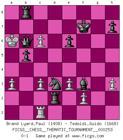 Last move : 0-1 2023 January 2 15:29:51 [Event "FICGS__CHESS__THEMATIC_TOURNAMENT__000253"] [Site "FICGS"] [Date "2022.09.24"] [Round "1"] [White "Brand Lyard,Paul"] [Black "Tedoldi,Guido"] [Result "0-1"] [WhiteElo "1408"] [BlackElo "1668"] 1.d4 d5 2.Nf3 Nf6 3.c4 e6 4.Nc3 c6 5.Qd3 dxc4 6.Qxc4 b5 7.Qd3 a6 8.g4 Nxg4 9.Bf4 Bb4 10.Bxb8 Rxb8 11.Rg1 Nh6 12.O-O-O Qf6 13.Bg2 Ng4 14.Rdf1 Bb7 15.h3 Qh6+ 16.e3 Nf6 17.Ne5 O-O 18.Be4 Rfd8 19.Nxf7 Kxf7 20.Rxg7+ Qxg7 21.Qd1 Bxc3 22.bxc3 Nxe4 23.Rg1 Qh6 24.Qf3+ Nf6 25.a3 c5 26.Kc2 Bxf3 27.dxc5 Ne4 28.c6 Rd2+ 29.Kb3 Qf6 30.Rc1 Nc5+ 31.Kb4 Nd3+ 32.Ka5 Qd8+ 33.Kxa6 Qb6+ 0-1 Follow this game move after move (download)Fischer is the strongest player in the world. In fact, the strongest player who ever lived. (Larry Evans) Wie bekannt hörte Morphy 1859 auf, Schach zu spielen. Seine Enttäuschung galt nicht so sehr dem Schach, wie den Schachspielern. (Robert James Fischer) Siempre es mucho mejor sacrificar las piezas de tu oponente. (Savielly Tartakover) Je fais ceci parce que dans cinquante coups j'obtiendrai cela; je m'appelle Mikhail Moisevitch Botvinnik. (Botvinnik) Dave, my mind is going. I can feel it. (HAL 9000 in 2001, a space odyssey)