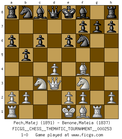 Last move : 1-0 2022 December 7 7:7:30 [Event "FICGS__CHESS__THEMATIC_TOURNAMENT__000253"] [Site "FICGS"] [Date "2022.09.24"] [Round "1"] [White "Pech,Matej"] [Black "Benone,Mateia"] [Result "1-0"] [WhiteElo "1891"] [BlackElo "1837"] 1.d4 d5 2.Nf3 Nf6 3.c4 e6 4.Nc3 c6 5.Qd3 dxc4 6.Qxc4 b5 7.Qd3 a6 8.g4 Nxg4 9.Rg1 Nf6 10.Bf4 1-0 This chess game has been lost on time (started : 2022.09.24 14:58:35) Follow this game move after move (download)Chess, like love, like music, has the power to make people happy. (Siegbert Tarrasch) Schach ist eine Sache der genauen Beurteilung, wann man zuschlagen und wann man sich ducken muss. (Robert James Fischer) El Ajedrez, como la música, como el amor, tiene el poder de hacer feliz a la gente. (Siegbert Tarrasch) La tactique, c'est ce que vous faites quand il y a quelque chose à faire; la stratégie, c'est ce que vous faites quand il n'y a rien à faire. (Savielli Tartacower) If you are good, you will be assigned all the work. If you are really good, you will get out of it. (Dan Rotaru)