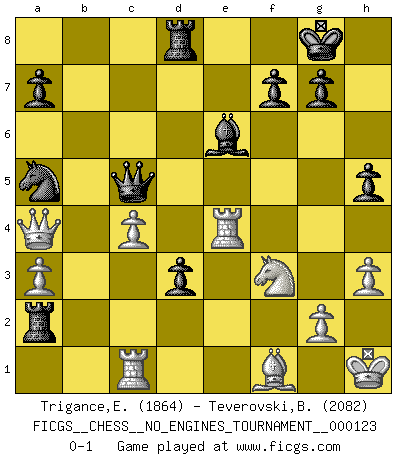 Last move : 0-1 2022 November 30 21:15:44 [Event "FICGS__CHESS__NO_ENGINES_TOURNAMENT__000123"] [Site "FICGS"] [Date "2022.09.24"] [Round "1"] [White "Trigance,Emile"] [Black "Teverovski,Bogoljub"] [Result "0-1"] [WhiteElo "1864"] [BlackElo "2082"] 1.a3 d5 2.d4 Nf6 3.Bf4 c5 4.c3 Nc6 5.h3 b6 6.e3 e6 7.Nd2 Bd6 8.Bxd6 Qxd6 9.dxc5 bxc5 10.Be2 O-O 11.Ngf3 Rd8 12.O-O e5 13.Nh2 d4 14.exd4 cxd4 15.c4 e4 16.Nb3 Rb8 17.Re1 d3 18.Bf1 Be6 19.Nd2 Rxb2 20.Nxe4 Nxe4 21.Rxe4 Na5 22.Qa4 Qc5 23.Rc1 Rxf2 24.Kh1 h5 25.Nf3 Ra2 0-1 Follow this game move after move (download)Even the laziest King flees wildly in the face of a double check ! (Aaron Nimzowitsch) Sie führen leise Selbstgespräche, schlürfen lautstark ihre Getränke, schmatzen hörbar beim Essen, blasen ihrem Gegenüber Rauch in die Augen, niesen ihm ins Gesicht, starren ihn unverwandt an, bis er sich unter ihren Blicken windet, rutschen ständig auf ihrem Stuhl hin und her, rülpsen und bohren in der Nase. (Anonymous) La belleza de un movimiento no se refleja solo en su apariencia, sino en el pensamiento detrás de él. (Siegbert Tarrasch) Soyez une menace à chaque fois que vous vous asseyez pour jouer. (Ken Smith) Chess is everything: art, science and sport. (Anatoly Karpov)