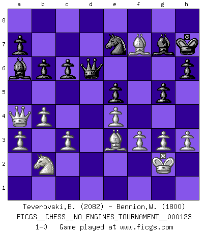 Last move : 1-0 2023 February 13 21:32:27 [Event "FICGS__CHESS__NO_ENGINES_TOURNAMENT__000123"] [Site "FICGS"] [Date "2022.09.24"] [Round "1"] [White "Teverovski,Bogoljub"] [Black "Bennion,William"] [Result "1-0"] [WhiteElo "2082"] [BlackElo "1800"] 1.a3 g6 2.Nf3 Bg7 3.d4 Nf6 4.h3 b6 5.Bf4 Bb7 6.Nbd2 d6 7.c3 Nbd7 8.Qc2 O-O 9.e4 e5 10.dxe5 Nh5 11.Bg5 f6 12.exf6 Nhxf6 13.Bc4+ Kh8 14.O-O Ne5 15.Nxe5 dxe5 16.Rad1 Qe7 17.Bd5 c6 18.Ba2 Rad8 19.b4 h6 20.Be3 Rd7 21.f3 Nh5 22.Nc4 Rfd8 23.Rxd7 Rxd7 24.Rd1 Nf4 25.Rxd7 Qxd7 26.Nb2 Kh7 27.Qb3 Qe8 28.Kh2 g5 29.Qa4 Qb8 30.g3 Ng6 31.Bf7 Ne7 32.Qb3 Qd6 33.Kg2 Ba6 34.Qa4 1-0 Follow this game move after move (download)Fischer prefers to enter Chess history alone. (Miguel Najdorf) Über Frauen: Chess is better. (Robert James Fischer) Un entendimiento minucioso de las típicas continuaciones de mate hacen de las mas complicadas combinaciones de sacrificio que conducen hacia ellas no solo no dificiles, sino casi un asunto de rutina. (Siegbert Tarrasch) Une platitude souvent récitée à propos des Echecs est qu'une des choses les plus difficiles à réaliser est de gagner une position gagnante. Cela ne manque pas de sens mais, pour ma part, j'ai toujours trouvé plus difficile de gagner une position perdante. (Tim Krabbe) Everything in life is luck. (Donald Trump)