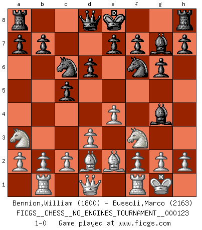 Last move : 1-0 2022 October 7 22:57:55 [Event "FICGS__CHESS__NO_ENGINES_TOURNAMENT__000123"] [Site "FICGS"] [Date "2022.09.24"] [Round "1"] [White "Bennion,William"] [Black "Bussoli,Marco"] [Result "1-0"] [WhiteElo "1800"] [BlackElo "2163"] 1.e4 c5 2.Na3 d6 3.Nf3 Bg4 4.Be2 Nf6 5.d3 g6 6.Rb1 Bg7 7.O-O Nc6 8.Bd2 1-0 Follow this game move after move (download)Alekhine is a poet who creates a work of art out of something that would hardly inspire another man to send home a picture post card. (Max Euwe) Bobby Fischer ist kein Vorbild für die heutige Jugend. (Viktor Kortschnoi) Robert Fischer es la ley hacia si mismo. (Larry Evans) Tout change constamment, y compris dans le monde des Echecs. (Botvinnik) Perhaps chess is the wrong game for the times (The Chess Master and the Computer, by Garry Kasparov - 2010)