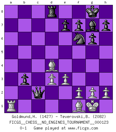 Last move : 0-1 2023 January 3 10:32:16 [Event "FICGS__CHESS__NO_ENGINES_TOURNAMENT__000123"] [Site "FICGS"] [Date "2022.09.24"] [Round "1"] [White "Goldmund,Heike"] [Black "Teverovski,Bogoljub"] [Result "0-1"] [WhiteElo "1427"] [BlackElo "2082"] 1.b4 d5 2.Bb2 Nf6 3.e3 g6 4.c4 Bg7 5.Nf3 O-O 6.Be2 a5 7.b5 dxc4 8.Bxc4 a4 9.a3 c6 10.O-O cxb5 11.Be2 Bd7 12.d3 Na6 13.Nbd2 Rc8 14.Re1 b4 15.axb4 Nxb4 16.Ne5 Nc2 17.Rf1 Nxa1 18.Qxa1 b5 19.Ndf3 b4 20.Nxd7 Qxd7 21.Ne5 Qb5 22.Nc4 a3 23.Bd4 Rfd8 24.Rb1 Ra8 25.Nxa3 Qa4 26.Nc2 Qxc2 27.Bf1 Rxa1 28.Rxa1 b3 0-1 Follow this game move after move (download)It is not enough to be a good player... you must also play well. (Siegbert Tarrasch) Es ist schade, dass viele Schachsportler vergessen, wie wichtig Auftreten und angemessene Kleidung sind. (Alexandra Kosteniuk) El Ajedrez es un regaderazo frío para la mente. (Sir John Simon) Les échecs c'est le défi de l'alpiniste, toujours plus haut, prêt à tout pour monter à l'assaut du Roi ennemi. Les échecs, c'est de la musique en mouvement, un ballet majestueux pour les yeux. C'est de la poésie composée par les fantômes du passé qui au même titre que Rimbaud ou Verlaine méritent notre admiration. Les échecs, c'est de la peinture ou le moindre mouvement modifie le tableau pour en faire un Picasso ou un Van Gogh. Les échecs, c'est tout et rien, c'est la vie et la mort. Jjulie33 sur le forum de France-Echecs. When you don't know what to do, walk fast and look worried. (Anonymous)