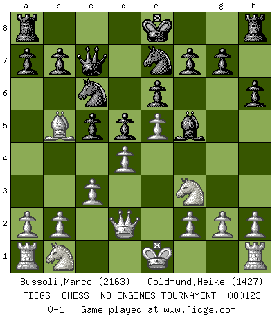 Last move : 0-1 2022 October 5 18:55:48 [Event "FICGS__CHESS__NO_ENGINES_TOURNAMENT__000123"] [Site "FICGS"] [Date "2022.09.24"] [Round "1"] [White "Bussoli,Marco"] [Black "Goldmund,Heike"] [Result "0-1"] [WhiteElo "2163"] [BlackElo "1427"] 1.e4 d5 2.e5 Bf5 3.d4 e6 4.Nf3 c5 5.c3 Nc6 6.Bg5 Qc7 7.Bb5 Be7 8.Qd2 h6 9.Bxe7 Ngxe7 0-1 Follow this game move after move (download)Methodical thinking is of more use in Chess than inspiration. (C. J. S. Purdy) Nur ein wirklich starker Spieler weiß wie schwach er spielt. (Savielly Grigorievitsch Tartakower) El Ajedrez es parte de la cultura, y si una cultura esta en decadencia, entonces también el Ajedrez declinará. (Mikhail Botvinnik) C'est la seule position que je connaisse où les deux camps sont mals. Propos prêtés à V. Anand. All the biggest technological inventions created by man - the airplane, the automobile, the computer - says little about his intelligence, but speaks volumes about his laziness. (Mark Kennedy)