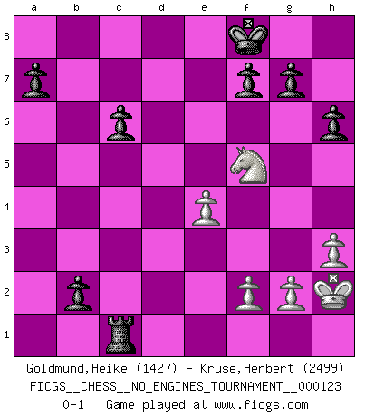 Last move : 0-1 2022 October 31 14:50:1 [Event "FICGS__CHESS__NO_ENGINES_TOURNAMENT__000123"] [Site "FICGS"] [Date "2022.09.24"] [Round "1"] [White "Goldmund,Heike"] [Black "Kruse,Herbert"] [Result "0-1"] [WhiteElo "1427"] [BlackElo "2499"] 1.b4 e5 2.Bb2 Bxb4 3.Bxe5 Nf6 4.a3 Be7 5.c4 O-O 6.e3 d5 7.cxd5 Nxd5 8.Nf3 Nc6 9.Be2 Nxe5 10.Nxe5 Bf6 11.d4 Bxe5 12.dxe5 Re8 13.O-O Rxe5 14.Nd2 Nc3 15.Qe1 Nxe2+ 16.Qxe2 Rd5 17.Rfd1 Be6 18.Nf3 c6 19.Rd4 Qf6 20.Rad1 Rad8 21.h3 h6 22.R1d2 Qe7 23.Qd1 Qxa3 24.R2d3 Rxd4 25.Nxd4 Qd6 26.Nxe6 Qxd3 27.Qxd3 Rxd3 28.Nc5 Rd1+ 29.Kh2 b5 30.e4 b4 31.Nb3 Rb1 32.Nd2 Rb2 33.Nc4 Rc2 34.Ne3 Rc1 35.Nf5 b3 36.Ne7+ Kf8 37.Nf5 b2 0-1 Follow this game move after move (download)Examine moves that smite! A good eye for smites is far more important than a knowledge of strategical principles. (Purdy) In Buenos Aires ist es nicht mein vorrangiges Ziel ein starkes Turnier zu organisieren, sondern ein Turnier für Gentlemen. Ich würde nie Kamsky einladen. Ich mag keine Probleme. (Miguel Najdorf) Cada Peón es potencialmente una Reina. (James Mason) Les échecs, c'est la lutte contre l'erreur. (Johannes Zukertort) Horse racing is animated roulette. (Roger Kahn)