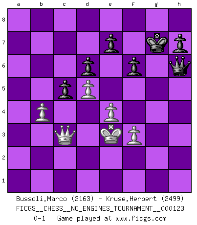 Last move : 0-1 2022 September 26 9:20:47 [Event "FICGS__CHESS__NO_ENGINES_TOURNAMENT__000123"] [Site "FICGS"] [Date "2022.09.24"] [Round "1"] [White "Bussoli,Marco"] [Black "Kruse,Herbert"] [Result "0-1"] [WhiteElo "2163"] [BlackElo "2499"] 1.d4 Nf6 2.c4 c5 3.d5 b5 4.cxb5 a6 5.b6 g6 6.Nc3 Bg7 7.Qb3 Bb7 8.e4 d6 9.a4 a5 10.Bb5+ Nbd7 11.Nf3 O-O 12.O-O Nxb6 13.Rd1 Ng4 14.h3 Ne5 15.Nxe5 Bxe5 16.Bh6 Bg7 17.Bxg7 Kxg7 18.Bc6 Rb8 19.Bxb7 Rxb7 20.Nb5 f6 21.Qc2 Na8 22.Rd3 Nc7 23.Rb3 Nxb5 24.axb5 Qb6 25.Qc4 Ra8 26.Kf1 a4 27.Rxa4 Rxa4 28.Qxa4 Ra7 29.Qc4 Ra1+ 30.Ke2 Qa5 31.Qc3 Qa4 32.Ke3 Re1+ 33.Qxe1 Qxb3+ 34.Qc3 Qxb5 35.g3 g5 36.h4 gxh4 37.gxh4 Qf1 38.f3 Qg1+ 39.Kd3 Qh1 40.Ke3 Qxh4 41.b4 Qh6+ 0-1 Follow this game move after move (download)Is Bobby Fischer quite sane ? (Salo Flohr) Im Spitzenschach von heute geht es nur um Vorbereitung, um tiefgründige, sorgfältige Eröffnungsvorbereitung. (Nigel Short) El Ajedrez es un invernadero donde los frutos del carácter pueden madurar mas completamente que en la vida. (Edward Morgan Foster) Si rien de grave n'est détecté lors de l'analyse d'une position, on joue alors le coup. Seconde règle de Blumenfeld. Beta. Software undergoes beta testing shortly before it's released. Beta is latin for still doesn't work. (Anonymous)
