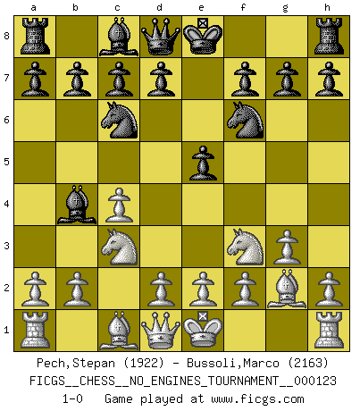 Last move : 1-0 2022 November 3 8:13:54 [Event "FICGS__CHESS__NO_ENGINES_TOURNAMENT__000123"] [Site "FICGS"] [Date "2022.09.24"] [Round "1"] [White "Pech,Stepan"] [Black "Bussoli,Marco"] [Result "1-0"] [WhiteElo "1922"] [BlackElo "2163"] 1.c4 Nf6 2.Nc3 e5 3.Nf3 Nc6 4.g3 Bb4 5.Bg2 1-0 Follow this game move after move (download)No price is too great for the scalp of the enemy King. (Koblentz) Fallen sollten polizeilich verboten werden. (Savielly Grigorievitsch Tartakower) Las Aperturas te enseñan aperturas. ¡Los Finales te enseñan Ajedrez!. (Stephan Gerzadowicz) La vérité est comme le meilleur coup aux échecs : elle existe, mais il faut la chercher. (Arturo Perez-Reverte) Opportunities multiply as they are seized. (Sun Tzu)