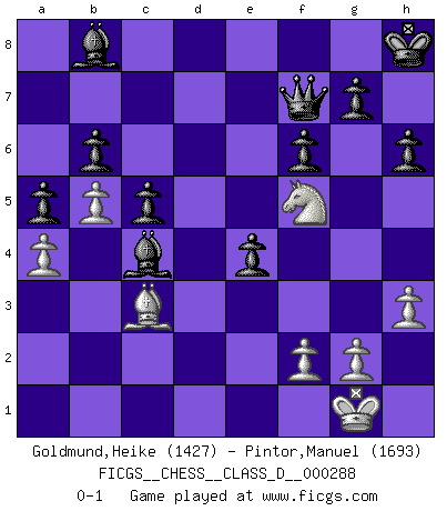 Last move : 0-1 2022 December 1 11:50:23 [Event "FICGS__CHESS__CLASS_D__000288"] [Site "FICGS"] [Date "2022.09.24"] [Round "1"] [White "Goldmund,Heike"] [Black "Pintor,Manuel"] [Result "0-1"] [WhiteElo "1427"] [BlackElo "1693"] 1.b4 e5 2.Bb2 Nc6 3.b5 Nd4 4.e3 Ne6 5.c4 Bc5 6.Nf3 d6 7.Be2 Nf6 8.O-O O-O 9.d3 h6 10.Nbd2 a5 11.a4 c6 12.d4 exd4 13.exd4 Ba7 14.Nb3 c5 15.d5 Nf4 16.Re1 Nxe2+ 17.Rxe2 Bg4 18.Nbd2 Re8 19.Rxe8+ Nxe8 20.h3 Bh5 21.Qc2 Nf6 22.Re1 Bg6 23.Qc3 Qf8 24.Nh4 Bh7 25.Nhf3 Re8 26.Nf1 b6 27.Ng3 Bb8 28.Nh5 Rxe1+ 29.Qxe1 Nxh5 30.Qe2 Nf4 31.Qe3 Nd3 32.Bc3 f6 33.Qe6+ Kh8 34.Qe3 Nb4 35.Nh2 Bg6 36.Nf3 Bd3 37.Bxb4 Bxc4 38.Bc3 Bxd5 39.Qd3 Qf7 40.Nh4 Bc4 41.Qe4 d5 42.Nf5 dxe4 0-1 Follow this game move after move (download)A strong memory, concentration, imagination, and a strong will is required to become a great Chess player. (Bobby Fischer) Früher wurde jeder komplizierte Zug, jedes interessante Opfer mit großem Beifall und Enthusiasmus aufgenommen. Heute schaltet man einfach seinen Fritz an, und man kann sehen, was los ist, ob der Zug geht oder nicht. (Vladimir Kramnik) Bobby Fischer es el mas grande genio de Ajedrez de todos los tiempos. (Alexander Kotov) Les Echecs mettent en conflit, non pas deux intelligences, mais deux volontés. (Lasker) The leaves of memory seemed to make a mournful rustling in the dark. (Henry Wadsworth Longfellow)