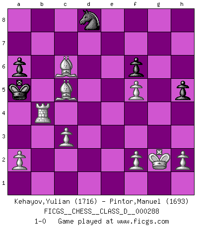 Last move : 1-0 2022 December 20 5:43:56 [Event "FICGS__CHESS__CLASS_D__000288"] [Site "FICGS"] [Date "2022.09.24"] [Round "1"] [White "Kehayov,Yulian"] [Black "Pintor,Manuel"] [Result "1-0"] [WhiteElo "1716"] [BlackElo "1693"] 1.e4 e5 2.Nf3 Nc6 3.Bb5 Bc5 4.c3 Qf6 5.d4 exd4 6.e5 Nxe5 7.Qe2 c6 8.Bd3 d6 9.cxd4 Bb4+ 10.Nc3 Ne7 11.dxe5 dxe5 12.O-O Bxc3 13.bxc3 Bg4 14.Qxe5 Bxf3 15.Qxf6 gxf6 16.gxf3 O-O-O 17.Be4 Ng6 18.Be3 a6 19.Kh1 h5 20.Rg1 Rhg8 21.Bd4 Ne5 22.Rxg8 Rxg8 23.f4 Nd7 24.Bf5 Kc7 25.Re1 c5 26.Re7 Rd8 27.Bxc5 Kc6 28.Bd4 Nc5 29.Rxf7 Rd6 30.Kg2 Ne6 31.Be4+ Kb5 32.Rxb7+ Ka4 33.Be3 Nd8 34.Rb4+ Ka5 35.Bc5 Re6 36.f5 Rc6 37.Bxc6 1-0 Follow this game move after move (download)One bad move nullifies forty good ones. (Horowitz) Wenn ein Kopf und ein Buch zusammenstoßen und es klingt hohl, ist es denn allemal im Buche? (Georg Christoph Lichtenberg) Un mal día en el Ajedrez, es mejor que cualquier buen día en el trabajo. (Anonymous) L'attaque fait le spectacle, la défense gagne les matchs. (Dicton footballistique) Hold em is to stud what chess is to checkers. (Johnny Moss)