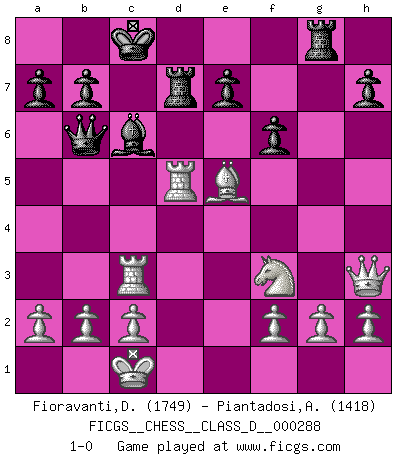 Last move : 1-0 2022 December 19 22:45:37 [Event "FICGS__CHESS__CLASS_D__000288"] [Site "FICGS"] [Date "2022.09.24"] [Round "1"] [White "Fioravanti,Diego"] [Black "Piantadosi,Angelo"] [Result "1-0"] [WhiteElo "1749"] [BlackElo "1418"] 1.e4 Nf6 2.Nc3 d5 3.e5 d4 4.exf6 dxc3 5.fxg7 cxd2+ 6.Bxd2 Bxg7 7.Qh5 Nd7 8.O-O-O Nf6 9.Qh4 Bd7 10.Bc3 c6 11.Nf3 Qc7 12.Bc4 O-O-O 13.Rhe1 Nd5 14.Bxg7 Rhg8 15.Be5 Qb6 16.Bxd5 cxd5 17.Re3 f6 18.Rc3+ Bc6 19.Qh3+ Rd7 20.Rxd5 1-0 Follow this game move after move (download)It's just you and your opponent at the board and you're trying to prove something. (Bobby Fischer) Ich spiele ehrlich und spiele, um zu gewinnen. Wenn ich verliere nehme ich meine Medizin. (Robert James Fischer) Los tropiezos estan todos ahí en el tablero, esperando que se cometan. (Savielly Tartakover) La solitude du joueur d'Echecs à l'approche du mat est semblable à celle du condamné. (Francis Szpiner) Whatever you do, don't be bored. This is absolutely the most exciting time we could have possibly hoped to be alive. And things are just starting. (From movie Waking life)
