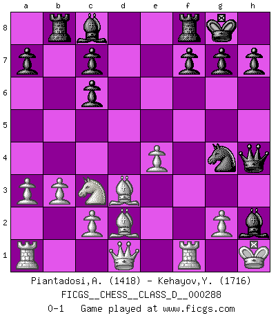 Last move : 0-1 2022 November 20 22:1:39 [Event "FICGS__CHESS__CLASS_D__000288"] [Site "FICGS"] [Date "2022.09.24"] [Round "1"] [White "Piantadosi,Angelo"] [Black "Kehayov,Yulian"] [Result "0-1"] [WhiteElo "1418"] [BlackElo "1716"] 1.e4 e5 2.Nf3 Nc6 3.d4 exd4 4.Nxd4 Nf6 5.Nxc6 bxc6 6.Nc3 Bb4 7.f3 O-O 8.Bd2 d5 9.a3 Bd6 10.Bd3 dxe4 11.fxe4 Rb8 12.b3 Ng4 13.O-O Bxh2+ 14.Kh1 Qh4 0-1 Follow this game move after move (download)I'm not a materialistic person, in that, I don't suffer the lack or loss of money. The absence of worldly goods I don't look back on. For Chess is a way I can be as materialistic as I want without having to sell my soul. (Jamie Walter Adams) Wenn ich einen Club besuche, sind die Spieler stumm vor Staunen. (José Raúl Capablanca) Nos gusta pensar. (Gary Kasparov) Le temps de noter son nom sur la feuille de partie, j'étais déjà en zeitnot ! D'un modeste amateur apparié lors de la première ronde d'un open contre le grand-maître Azmaïparashvili. Computer Science is no more about computers than astronomy is about telescopes. (Edsger W. Dijkstra)