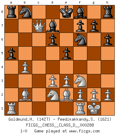 Last move : 1-0 2022 October 30 4:51:12 [Event "FICGS__CHESS__CLASS_D__000288"] [Site "FICGS"] [Date "2022.09.24"] [Round "1"] [White "Goldmund,Heike"] [Black "Peedikakkandy,Sameer"] [Result "1-0"] [WhiteElo "1427"] [BlackElo "1621"] 1.b4 e5 2.Bb2 d6 3.e3 a6 4.c4 Bd7 5.Nf3 Nf6 6.Be2 b6 7.O-O c5 8.a3 cxb4 9.axb4 Qc7 10.Qc2 a5 11.d3 b5 12.Nbd2 bxc4 13.Qxc4 h6 14.Qxc7 1-0 Follow this game move after move (download)Fischer is the strongest player in the world. In fact, the strongest player who ever lived. (Larry Evans) Schach ist wie eine schöne Frau, zu der wir ständig zurückkehren, gleichviel, wie oft sie uns zurückweist. (Anonymous) Tu no necesitas jugar muy bien, únicamente ayudar a tu oponenet a que juegue muy mal. (Genrikh Chepukaitis) C'est la seule position que je connaisse où les deux camps sont mals. Propos prêtés à V. Anand. A clear conscience is usually the sign of a bad memory. (Unknown)