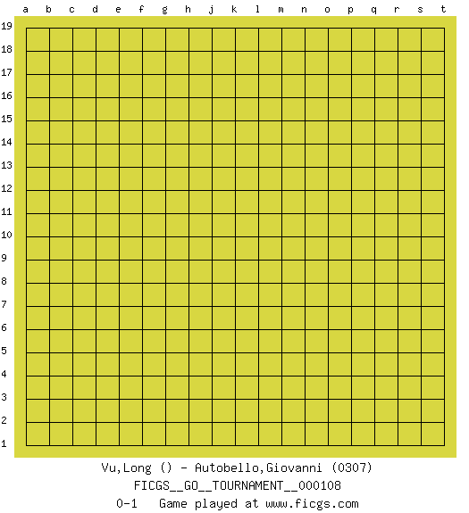 Last move : 0-1 2022 October 25 6:25:31 [Event "FICGS__GO__TOURNAMENT__000108"] [Site "FICGS"] [Date "2022.09.24"] [Round "1"] [Black "Vu,Long"] [White "Autobello,Giovanni"] [Result "0-1"] [Rating 2 "0307"] 0-1 This go game has been lost on time (started : 2022.09.24 23:37:54) Follow this game move after move (download)If you have lost four corners, resign. (Anonymous) The greatest con, that he ever pulled... was making you believe... that he is you. (Revolver, movie)