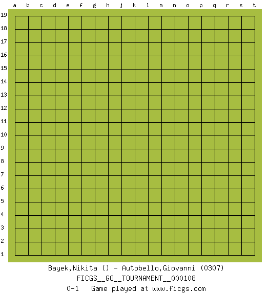 Last move : 0-1 2022 October 25 6:25:31 [Event "FICGS__GO__TOURNAMENT__000108"] [Site "FICGS"] [Date "2022.09.24"] [Round "1"] [Black "Bayek,Nikita"] [White "Autobello,Giovanni"] [Result "0-1"] [Rating 2 "0307"] 0-1 This go game has been lost on time (started : 2022.09.24 23:37:54) Follow this game move after move (download)To reduce an opponent's large prospective territory, strike at the shoulder. (Anonymous) Remember : Your focus determines your reality. (Qui-Gon Jinn in Star Wars ep.1)
