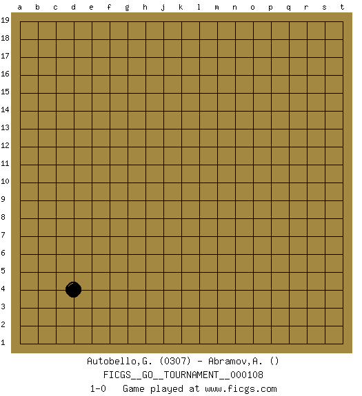 Last move : 1-0 2022 October 25 18:47:38 [Event "FICGS__GO__TOURNAMENT__000108"] [Site "FICGS"] [Date "2022.09.24"] [Round "1"] [Black "Autobello,Giovanni"] [White "Abramov,Aleksandr"] [Result "1-0"] [Rating 1 "0307"] 1.d4 1-0 This go game has been lost on time (started : 2022.09.24 23:37:54) Follow this game move after move (download)The carpenter's square becomes ko. (Anonymous) Perhaps chess is the wrong game for the times (The Chess Master and the Computer, by Garry Kasparov - 2010)