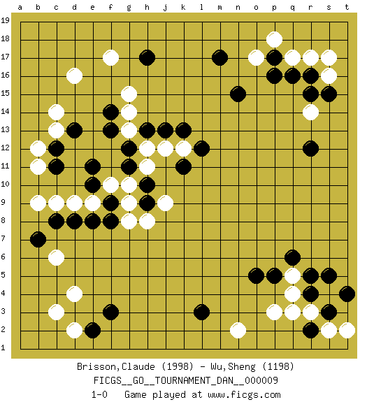 Last move : 1-0 2007 November 13 16:17:7 [Event "FICGS__GO__TOURNAMENT_DAN__000009"] [Site "FICGS"] [Date "2007.08.11"] [Round "1"] [Black "Brisson,Claude"] [White "Wu,Sheng"] [Result "1-0"] [Rating 1 "1998"] [Rating 2 "1198"] 1.q16 d16 2.r4 d4 3.f3 c6 4.l3 r14 5.r12 r17 6.r16 q17 7.p16 s16 8.s15 s17 9.r15 o17 10.n15 p3 11.p5 r3 12.s3 q4 13.r2 q3 14.r5 q5 15.q6 s4 16.s5 s2 17.t4 t2 18.o5 n2 19.m17 f17 20.c11 c13 21.c8 d2 22.e2 c3 23.e8 d9 24.d8 c9 25.e11 e9 26.f9 b9 27.b7 b11 28.c12 b12 29.d13 c14 30.p17 p18 31.h17 f10 32.e10 g10 33.f8 g13 34.g12 h12 35.g11 h11 36.h10 g9 37.h9 g8 38.h13 h8 39.j13 k12 40.k11 j12 41.f13 g14 42.k13 j9 43.f14 g15 44.l12 1-0 Here are the names of the openings (joseki) played in the four corners : Corner d4 : d4 f3 Hoshi (Hwajeom, Seongjeom, Xingwei`) 4-4 Point. The star or hoshi (4-4) point, emphasizing influence at the potential expense of territory. Ikken Kakari (Hankan Keolch'im, Yi Gua`jiao~, 1-Space Low Approach). Black 2 is the standard approach move to the 4-4. Corner q16 : q16 r14 Hoshi (Hwajeom, Seongjeom, Xingwei`) 4-4 Point. The star or hoshi (4-4) point, emphasizing influence at the potential expense of territory. Ikken Kakari (Hankan Keolch'im, Yi Gua`jiao~, 1-Space Low Approach). White 2 is the standard approach move to the 4-4. Player Black won this Go (weiqi, baduk) game. Follow this game move after move (download)Take the cutting stone on the second line. (Anonymous) Life is the sum of all your choices. (Albert Camus)