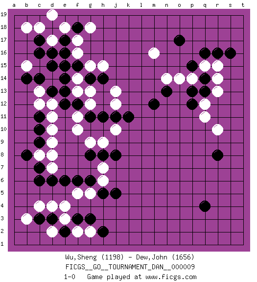 Last move : 1-0 2008 January 29 0:8:26 [Event "FICGS__GO__TOURNAMENT_DAN__000009"] [Site "FICGS"] [Date "2007.08.11"] [Round "1"] [Black "Wu,Sheng"] [White "Dew,John"] [Result "1-0"] [Rating 1 "1198"] [Rating 2 "1656"] 1.q16 c4 2.q4 d17 3.d15 f16 4.c17 c18 5.c16 b18 6.c11 c13 7.d13 d14 8.c14 d12 9.e14 c12 10.e12 d11 11.e17 e18 12.d16 f17 13.d18 d19 14.f18 d17 15.e16 g18 16.c10 d10 17.c9 f10 18.c6 e4 19.g3 f2 20.e6 f5 21.f6 g5 22.g6 h6 23.h5 h7 24.j5 d7 25.c7 d8 26.d6 d9 27.g8 h9 28.d3 d4 29.c3 b3 30.f3 e3 31.e2 g2 32.h2 d2 33.h8 g9 34.j8 g12 35.g14 h15 36.o17 r10 37.r8 r14 38.s16 p14 39.q13 r13 40.q14 r15 41.r16 q15 42.p15 q12 43.p13 o14 44.p12 q11 45.n13 n14 46.m12 m16 47.h14 f13 48.e13 f14 49.f15 g15 50.f12 g13 51.g11 j13 52.h11 j10 53.j11 j12 54.k11 f11 55.e15 b15 56.b14 c8 57.b8 1-0 This go game has been lost on time (started : 2007.08.11 10:54:32) Here are the names of the openings (joseki) played in the four corners : Corner d16 : d17 d15 Komoku (Somok, Xiao~mu`) 3-4 Point. The komoku (3-4) point is the traditional corner enclosure move.. Ikken Takagakari (Hankan Nop'dakeolch'im, Yi Gaogua`jiao~, 1-Space High Approach). The 5-4 approach move has become more popular in modern times, as modern Go emphasizes speed and influence. Corner d4 : c4 c9 Komoku (Somok, Xiao~mu`) 3-4 Point. The komoku (3-4) point is the traditional corner enclosure move.. Player Black won this Go (weiqi, baduk) game. Follow this game move after move (download)One point in the center is worth ten in the corner. (Anonymous) Creativity involves breaking out of established patterns in order to look at things in a different way. (Edward De Bono)