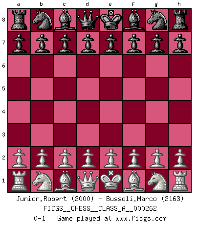 Last move : 0-1 2022 November 4 8:19:28 [Event "FICGS__CHESS__CLASS_A__000262"] [Site "FICGS"] [Date "2022.09.24"] [Round "1"] [White "Junior,Robert"] [Black "Bussoli,Marco"] [Result "0-1"] [WhiteElo "2000"] [BlackElo "2163"] 0-1 This chess game has been lost on time (started : 2022.09.24 23:41:37) Follow this game move after move (download)One bad move nullifies forty good ones. (Horowitz) Frage des Reporters: -Worin besteht das Ziel von Gambiteröffnungen? Antwort: -Auf Kosten der Partie einen Ruf als Angriffspieler zu erwerben.- (Siegbert Tarrasch) Prefiero perder una partida realmente buena, que ganar una mala. (David Levy) La guerre est enfant de la passion, la passion est enfant du narcissisme et le narcissisme est l'enfant. (...) Une autre partie ? (Thibault de Vassal) The next best thing to gambling and winning is gambling and loosing. (Nick Dandalos)