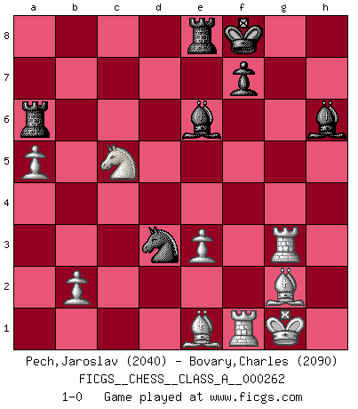 Last move : 1-0 2023 June 14 10:10:15 [Event "FICGS__CHESS__CLASS_A__000262"] [Site "FICGS"] [Date "2022.09.24"] [Round "1"] [White "Pech,Jaroslav"] [Black "Bovary,Charles"] [Result "1-0"] [WhiteElo "2040"] [BlackElo "2090"] 1.c4 e5 2.Nc3 Nf6 3.Nf3 Nc6 4.g3 d5 5.cxd5 Nxd5 6.Bg2 Nb6 7.O-O Be7 8.d3 g5 9.Be3 g4 10.Nd2 Nd4 11.a4 a5 12.Nb5 O-O 13.Nxd4 exd4 14.Bh6 Re8 15.Nb3 c6 16.Bd2 h5 17.Nxa5 h4 18.Be4 Nd5 19.Nc4 Nf6 20.Bh1 Be6 21.Qc2 Nd5 22.a5 Ra6 23.gxh4 Bxh4 24.e4 dxe3 25.fxe3 c5 26.Bg2 Bf6 27.Rae1 Bg7 28.Re2 g3 29.hxg3 Qg5 30.Ref2 Qxg3 31.Rf3 Qg4 32.Be1 Nb4 33.Qa4 Bd7 34.Rg3 b5 35.Rxg4 bxa4 36.Rg5 Kf8 37.Nb6 Be6 38.Nxa4 Bh6 39.Rg3 Nxd3 40.Nxc5 1-0 Follow this game move after move (download)Nonsense was the last thing Fischer was interested in, as far as Chess was concerned. (Elie Agur) Schach ist Leben. (Robert James Fischer) Bobby solo arroja las piezas y solas caen en las casillas correctas. (Miguel Najdorf ) 'L'échange des dames est un coup dur pour les deux adversaires...' Un journaliste lors d'une partie du match Spassky-Fischer Empty your mind, be formless, shapeless — like water. (Bruce Lee)