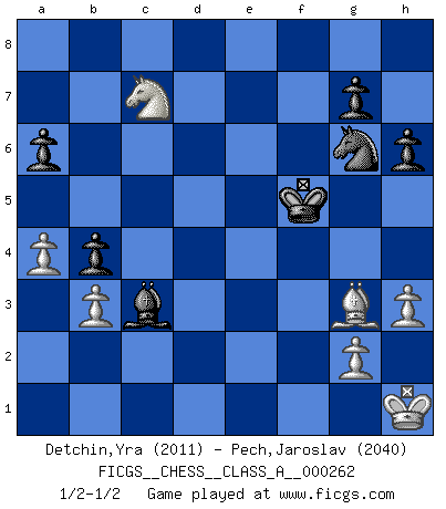 Last move : 1/2-1/2 2023 August 18 16:0:5 [Event "FICGS__CHESS__CLASS_A__000262"] [Site "FICGS"] [Date "2022.09.24"] [Round "1"] [White "Detchin,Yra"] [Black "Pech,Jaroslav"] [Result "1/2-1/2"] [WhiteElo "2011"] [BlackElo "2040"] 1.e4 c5 2.Nf3 Nc6 3.Bb5 d6 4.O-O Bd7 5.Re1 Nf6 6.h3 a6 7.Bf1 e5 8.c3 Be7 9.d4 cxd4 10.cxd4 exd4 11.Nxd4 O-O 12.Nc3 Re8 13.Bf4 h6 14.Qd2 b5 15.a3 Ne5 16.Kh1 Rc8 17.Rad1 Qb6 18.Bh2 Qb7 19.f3 Bd8 20.Nc2 Bb6 21.Bg3 Nh5 22.Bh2 Qa7 23.Nd4 Ba5 24.Rc1 Bb6 25.Red1 Nf6 26.Rc2 Qb7 27.Bg1 Rcd8 28.R2c1 d5 29.exd5 Nxd5 30.Ne4 Qb8 31.Bh2 Ne7 32.b3 f6 33.Qc3 Nd5 34.Qd2 Ne7 35.Qb2 Nf5 36.Nxf5 Bxf5 37.Re1 Bd4 38.Qe2 Qb6 39.a4 Bd7 40.Qa2 Be6 41.Bg3 Bf7 42.Qc2 b4 43.f4 Ng6 44.Bc4 f5 45.Bxf7+ Kxf7 46.Nd2 Rxe1+ 47.Rxe1 Bc3 48.Nc4 Qd4 49.Qxf5+ Qf6 50.Qxf6+ Kxf6 51.Re2 Kf5 52.Re8 Rxe8 53.Nd6+ Ke6 54.f5+ Kf6 55.Nxe8+ Kxf5 56.Nc7 1/2-1/2 Follow this game move after move (download)I have never in my life played the French Defence, which is the dullest of all openings. (Wilhelm Steinitz) Jeder leidlich begabte Spieler, er braucht keineswegs hervorragend veranlagt zu sein, kann es zum Meister bringen. Aber das ist ja auch gar nicht nötig! Der richtige Standpunkt ist es, zu seinem Vergnügen zu spielen, und man glaube ja nicht, dass der Genuss proportional dem Können sei. (Siegbert Tarrasch) ¿Que sería del Ajedrez sin errores graciosos?. (Kurt Richter) On entre au jeu d'Echecs comme on entre en Religion. Pour le joueur d'Echecs, la partie d'Echecs c'est l'office, la messe, le défilé du 1er Mai, le dépôt de gerbe au Monument aux Morts. C'est un drame sacré. (Michel Roos) Memory is a complicated thing, a relative to truth, but not its twin. (Barbara Kingsolver, Animal Dreams)
