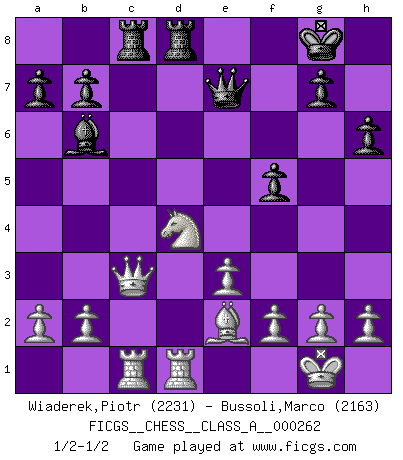 Last move : 1/2-1/2 2022 November 1 20:27:57 [Event "FICGS__CHESS__CLASS_A__000262"] [Site "FICGS"] [Date "2022.09.24"] [Round "1"] [White "Wiaderek,Piotr"] [Black "Bussoli,Marco"] [Result "1/2-1/2"] [WhiteElo "2231"] [BlackElo "2163"] 1.d4 Nf6 2.c4 e6 3.Nf3 d5 4.Nc3 Bb4 5.Bg5 h6 6.Bxf6 Qxf6 7.e3 O-O 8.Rc1 dxc4 9.Bxc4 c5 10.Qb3 Qe7 11.O-O Rd8 12.Ne4 cxd4 13.Nxd4 Ba5 14.Be2 Bb6 15.Nb5 Nc6 16.Rfd1 Bd7 17.Nbd6 Rab8 18.Qc3 f5 19.Nc5 Bc8 20.Nxc8 Rbxc8 21.Nxe6 Nd4 22.Nxd4 1/2-1/2 Follow this game move after move (download)First-class players lose to second-class players because second-class players sometimes play a first-class game. (Siegbert Tarrasch) Taktik ist was man tun muß, wenn etwas zu tun ist. Strategie ist was man tun muß, wenn nichts zu tun ist. (Savielly Grigorievitsch Tartakower) Tu cuerpo tiene que estar en óptima condición. Tu Ajedrez se deteriora como lo hace tu cuerpo. No puedes separar la mente y el cuerpo. (Bobby Fischer) Les sacrifices démontrent seulement que quelqu'un a gaffé. (Savielly Tartacover) How many people work in NATO Headquarters ? - About half of them. (Dirk Stikker, NATO general secretary)