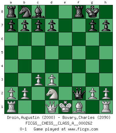 Last move : 0-1 2022 November 12 13:30:14 [Event "FICGS__CHESS__CLASS_A__000262"] [Site "FICGS"] [Date "2022.09.24"] [Round "1"] [White "Droin,Augustin"] [Black "Bovary,Charles"] [Result "0-1"] [WhiteElo "2000"] [BlackElo "2090"] 1.e4 e5 2.Nf3 f5 3.Nxe5 Qf6 4.Nc4 fxe4 5.Nc3 Qg6 6.d3 Bb4 7.Bd2 Nf6 8.Nxe4 Bxd2+ 9.Ncxd2 O-O 10.Nxf6+ Qxf6 11.c3 Qxf2+ 0-1 Follow this game move after move (download)You know, comrade Pachman, I don't enjoy being a Minister, I would rather play Chess like you. (Che Guevara) Ja, ich habe einmal eine Blitzpartie gespielt, es war in einem Zug, 1929. --im Interview 1989 (Mikhail Moiseyevich Botvinik) Yo no creo en la psicología. Yo creo en las buenas movidas. (Bobby Fischer) Vous m'avez demandé de vous exposer quel est le fondement de la prière. Je ne fais que préparer les pièces du jeu sur la table... Nous sera-t-il permis d'en adopter les règles et si nous les appliquons scrupuleusement nous ne tarderons pas à faire mat le Roi divin ! Il ne pourra échapper à nos mains. (Sainte Thérèse d'Avila, Chemin de perfection) Statistics can be made to prove anything - even the truth. (Author unknown)