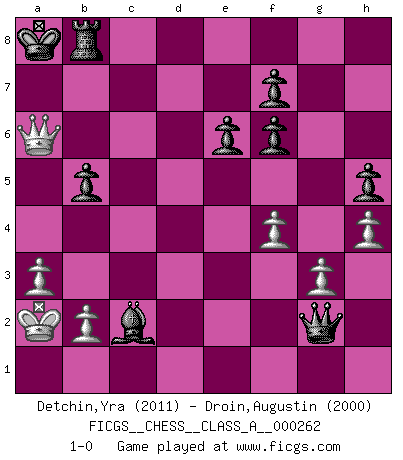 Last move : 1-0 2023 January 1 23:37:6 [Event "FICGS__CHESS__CLASS_A__000262"] [Site "FICGS"] [Date "2022.09.24"] [Round "1"] [White "Detchin,Yra"] [Black "Droin,Augustin"] [Result "1-0"] [WhiteElo "2011"] [BlackElo "2000"] 1.e4 c5 2.Nf3 d6 3.d4 cxd4 4.Nxd4 Nf6 5.Nc3 Bd7 6.Bg5 e6 7.Ndb5 Bc6 8.Bxf6 gxf6 9.Qd3 a6 10.Nd4 Bd7 11.O-O-O Nc6 12.f4 Qb6 13.Nb3 Qc7 14.Kb1 O-O-O 15.Qf3 h5 16.Qf2 b5 17.h4 Qa7 18.Qe2 Kb8 19.a3 Rc8 20.Rh3 Be7 21.Na2 Qb6 22.Rc3 Na7 23.Nd4 Rxc3 24.Nxc3 Nc6 25.Nxc6+ Bxc6 26.Nd5 Qb7 27.Nxe7 Qxe7 28.g3 Qb7 29.Rxd6 Bxe4 30.Qe3 Bxc2+ 31.Ka2 Ka8 32.Bg2 Qxg2 33.Rxa6+ Kb8 34.Qa7+ Kc8 35.Qc5+ Kb8 36.Qd6+ Kb7 37.Rb6+ Ka8 38.Rb8+ Rxb8 39.Qa6+ 1-0 Follow this game move after move (download)The isolated Pawn casts gloom over the entire chessboard. (Aaron Nimzovich) Spielt Blackmar-Diemer-Gambit, und das Matt kommt von selbst! (Emil Joseph Diemer) El Ajedrez es un juego terrible. Si no dominas el centro, tu oponente tiene una posición mas libre. Si tu tienes el centro, entonces realmente tienes algo de que preocuparte. (Siegbert Tarrasch) Les écrivains ont utilisé les échecs pour analyser les côtés extrêmes de la nature humaine. Dans ce cadre, les échecs offrent un champ d'expérimentation idéal. Mais on pourrait faire la même chose avec la peinture. Et là, en vous référant à Van Gogh, vous ne tirerez pas de conclusion définitive sur les peintres. (Gary Kasparov) I don't believe in psychology. I believe in good moves. (Bobby Fischer)